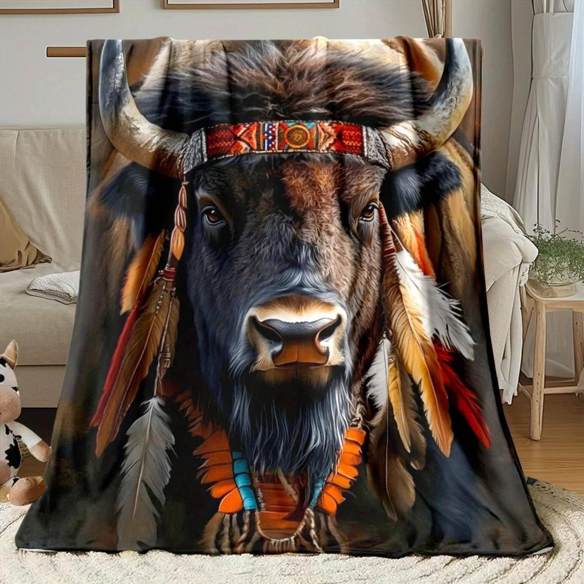 1 Native American Buffalo Feather Headband Flannel Blanket - Warm and soft, suitable for sofas, beds, living rooms, offices,