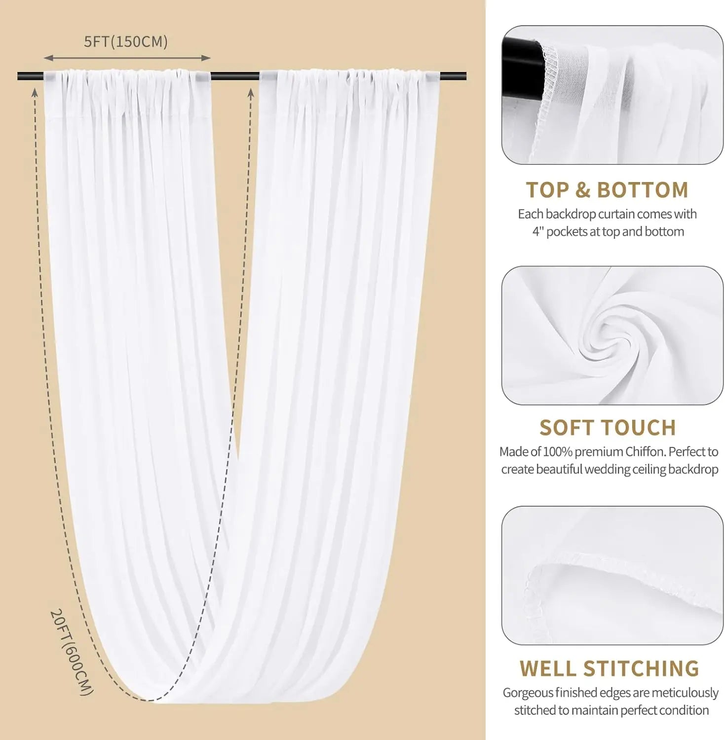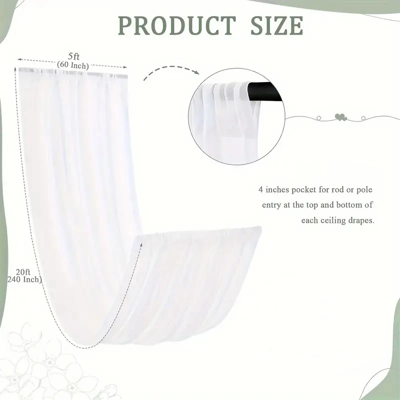 Size & Color - Wedding Ceiling Drapes: Our white ceiling drapery contains 4 panels. Each panel is 5FT width x20FT length. Wedding arch drapes is long enough creating a great eye catching detail in wedding party events decor.