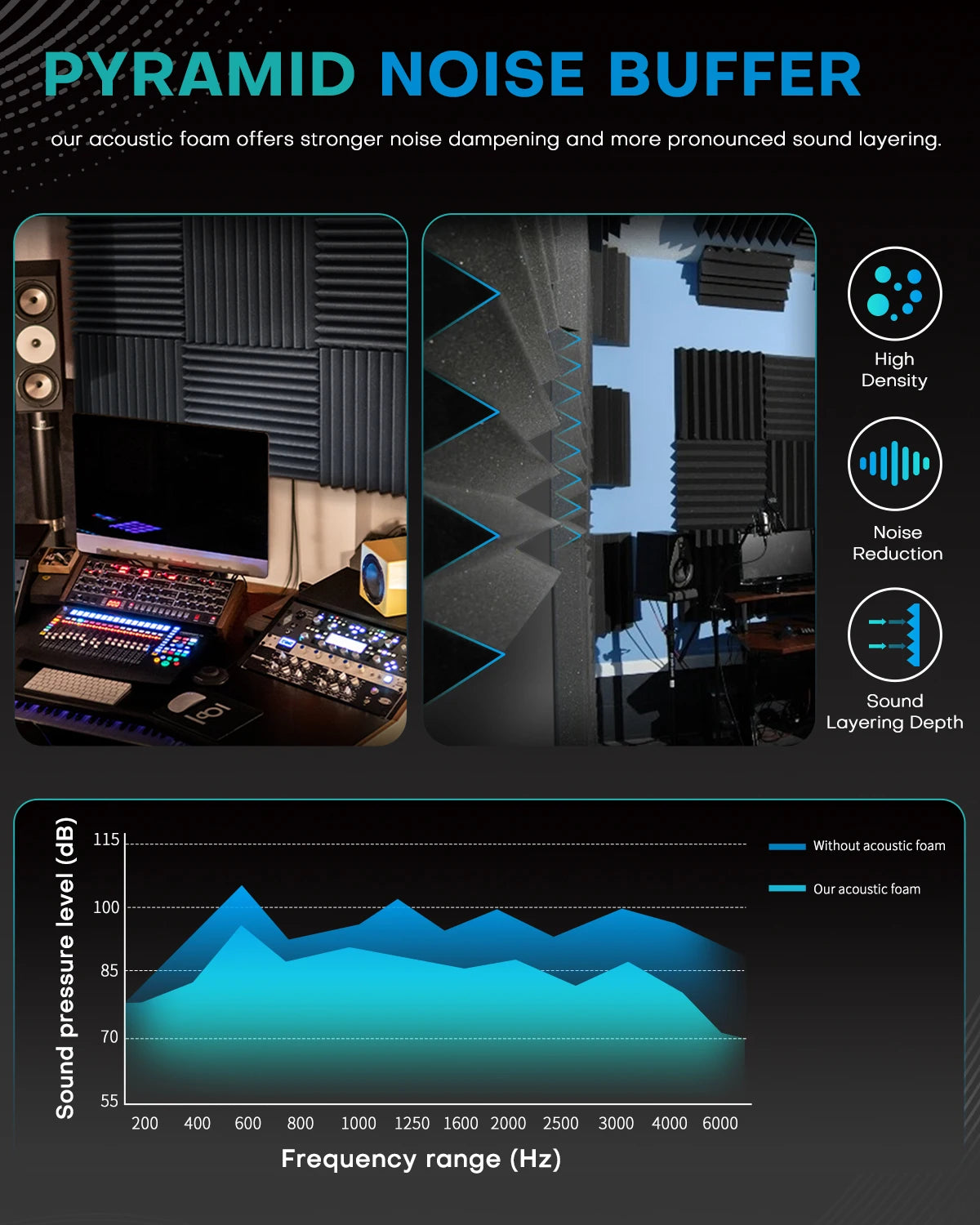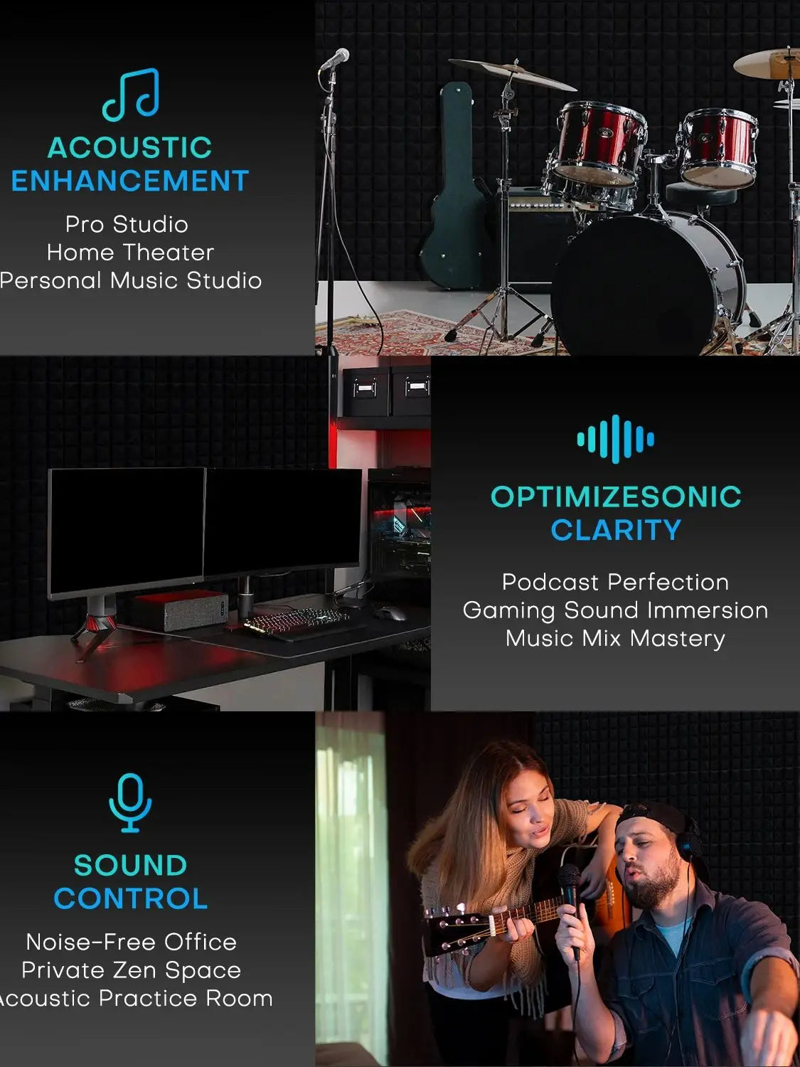 Acoustic Foam: Absorbs mid-to-high-frequency sound waves (e.g., voices, music) to reduce echoes and improve sound clarity. Ideal for studios, home theaters, or offices.