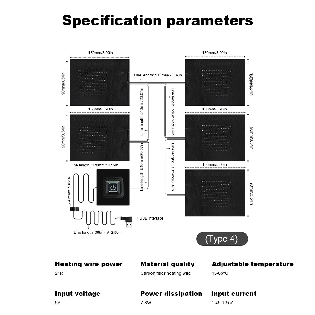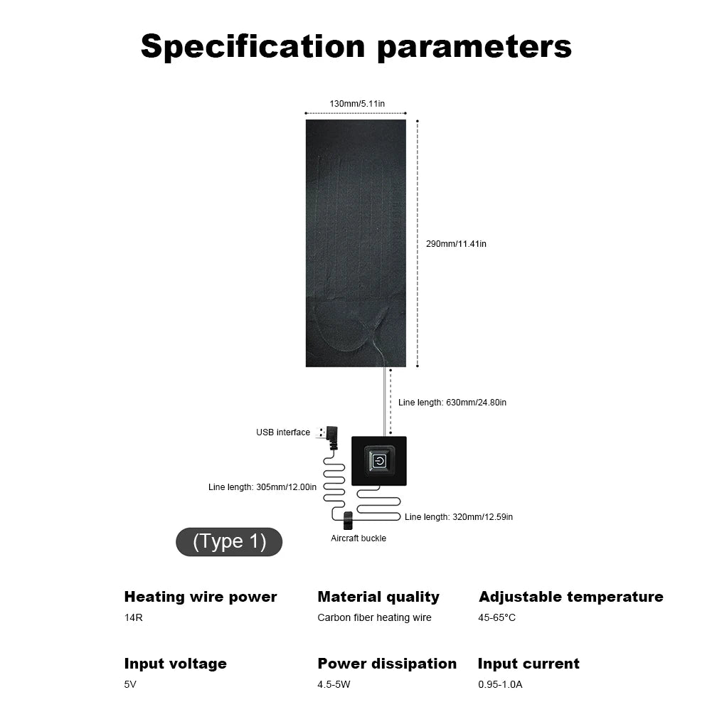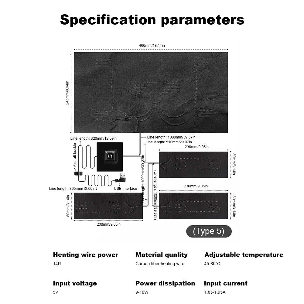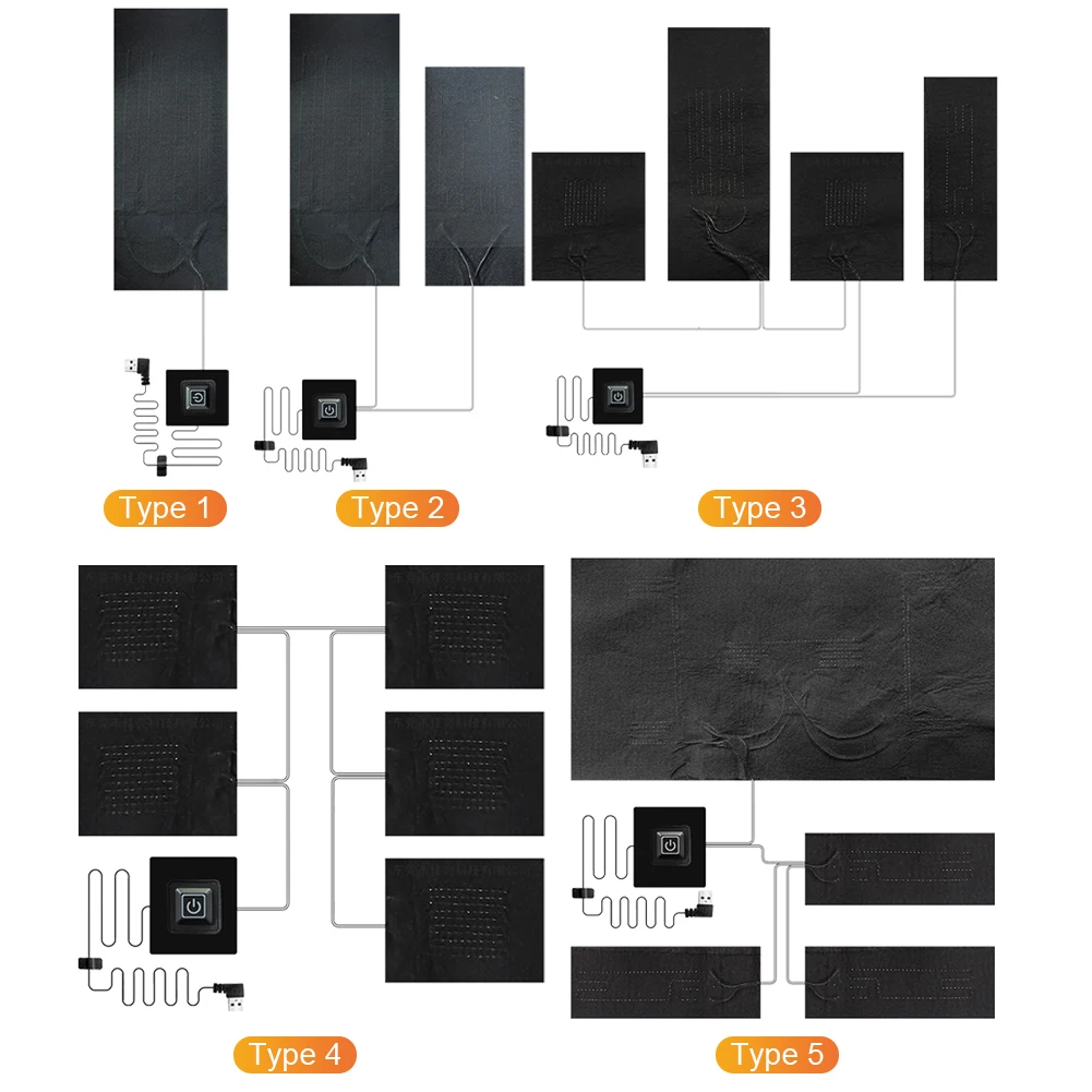 Feature: 1. Versatile DIY Heat Clothing: With USB heater pad, you can create your own heat clothing, such as heated vests, jackets, waistcoats, neck warmers, and hand warmers, using our products. 2. Imported Composite Fiber Heating Wire: With temperature control pad, you can experience fast heating, enhanced safety, long-lasting temperature retention, extended lifespan, and energy efficiency. 3. Rigorous Waterproof Treatment: Heating warmer pad can be conveniently hand-washed or machine-washed without compromising its performance. 4. Intelligent Three-Level Temperature Control: Effortlessly adjust the heat settings of cloth jacket heater pads to your desired level, ensuring comfort and peace of mind. 5. Superior Value and Style: Compared to ready-made heated clothing available in the market, thermal pads can crafting your own heat clothing offers greater cost-effectiveness and a wider range of fashionable designs. Specification: Origin: Mainland China Type: Pocket, Multi Tools Name: Intelligent constant temperature heating pad Material: Carbon fiber Model: Type 1/Type 2/Type 3/Type 4/Type 5(Optional) Heating wire power: 14R (one driven one), 24R (one driven two), 24R (one driven four), 24R (one driven five), 14R (one driven nine) Power consumption: 4.5-5W (one to one), 8-9W (one to two), 7-9W (one to four), 7-8W (one to five), 9-10W (one to nine) Input current: Type 1: 0.95-1.0A (one driven one), Type 2: 1.5-1.6A (one driven two), Type 3: 1.75-1.8A (one driven four), Type 4: 1.45-1.55A (one driven five), Type 5: 1.85-1.95A (one driven nine) Size: Please refer to the picture for detailed dimensions Power supply method: USB charging Input voltage: 5V 2A Adjustable temperature: 45 ° C-65 ° C Gear setting: red (high gear), blue (medium gear), green (low gear) Usage: self-made heating clothes, heating vests, heating vests, heating necklaces, heating handbags and other products Note: Due to the different monitor and light effect, the actual color of the item might be slightly different from the color showed on the pictures. Thank you! Please allow 1-2cm measuring deviation due to manual measurement.