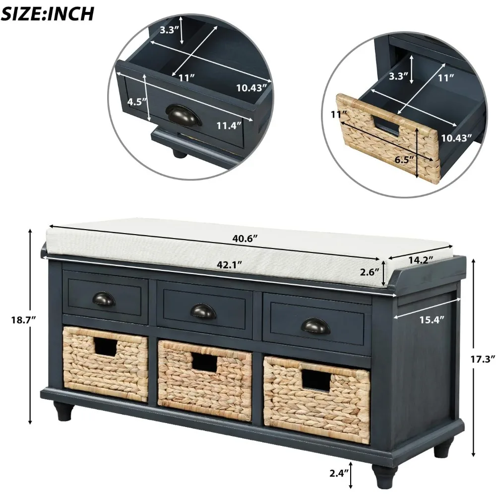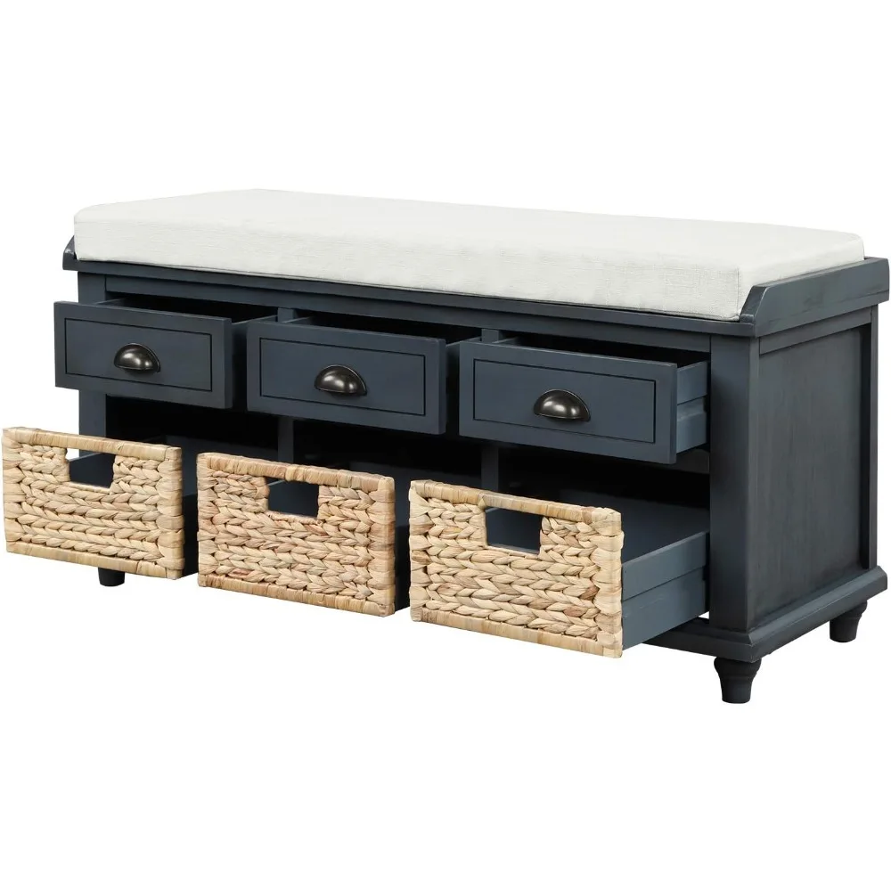 - This chic bench matches fashion with the function, it features 3 drawers and 3 removable wicker baskets. This bench add versatile appeal to any space.