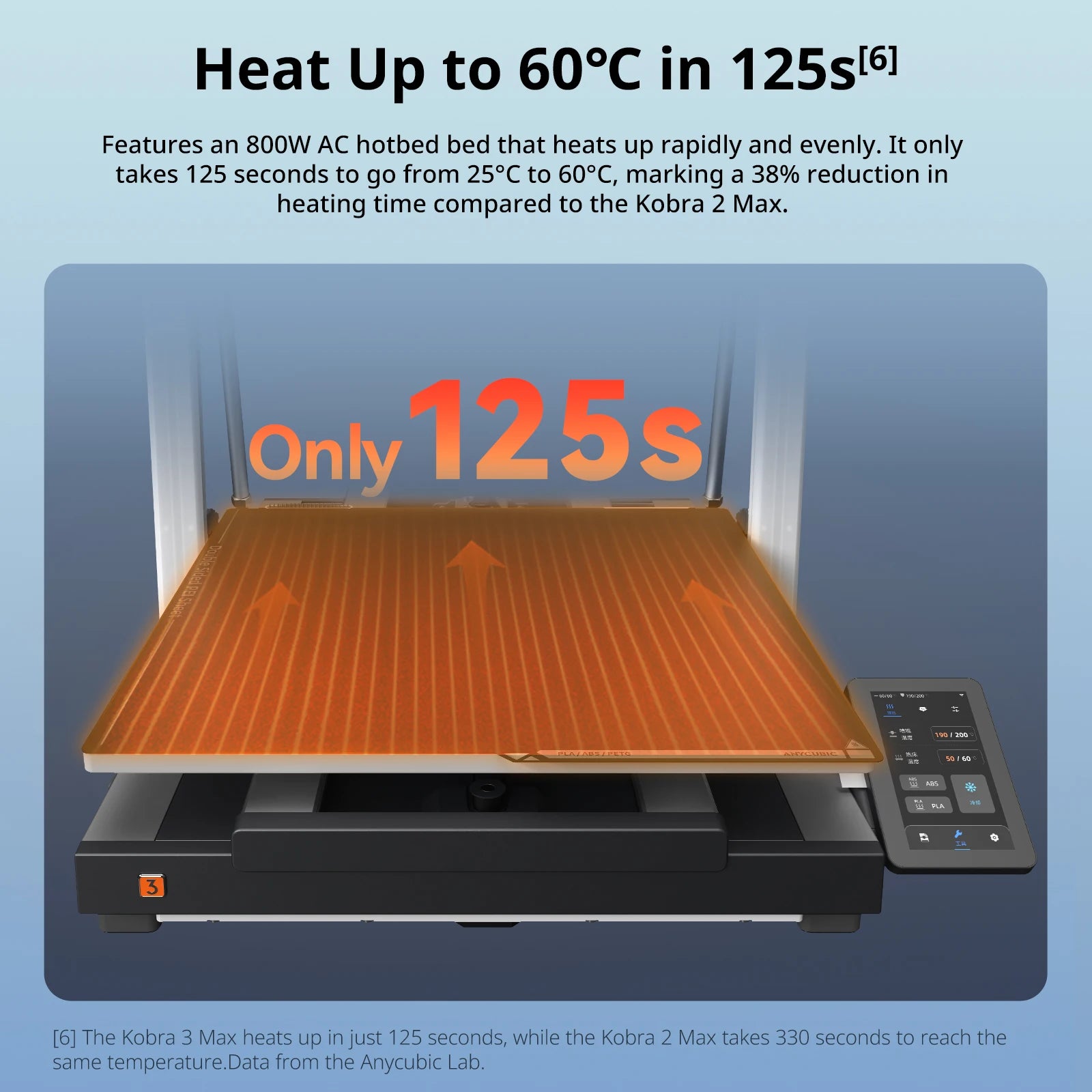 The Anycubic Kobra 3 Max features an 800W AC heated bed that heats up rapidly and evenly. It only takes 125 seconds to go from 25°C to 60°C marking a 38% reduction in heating time compared to the Kobra 2 Max. Equipped with a real-time current load system that monitors the hotbed circuit system to precisely controls the hotbed temperature and detects abnormal fluctuations,the printer ensures optimum safety and performance. Additionally, the V0-grade fireproof material used in the hot bed shell quarantees safety even in extreme conditions.