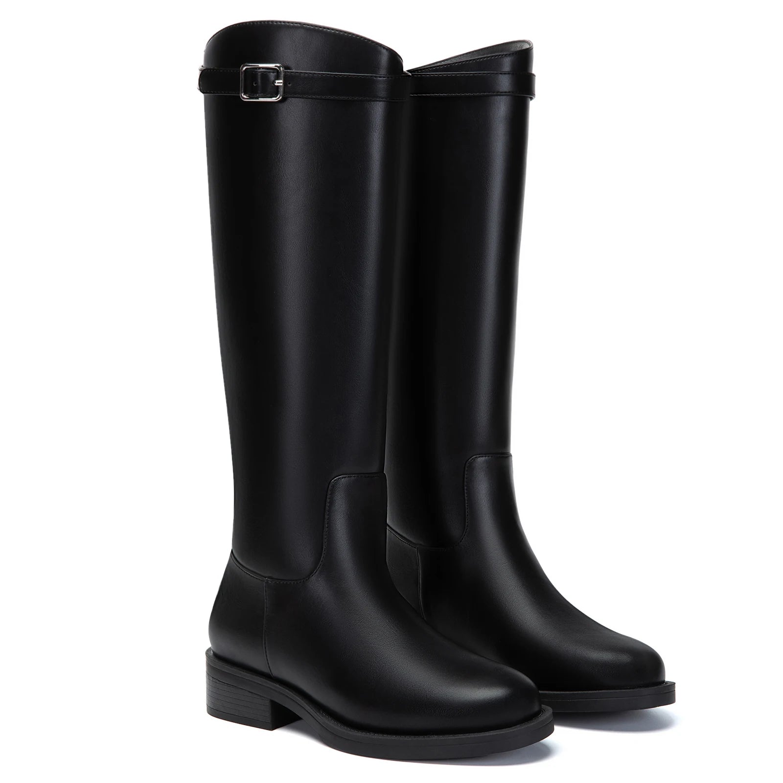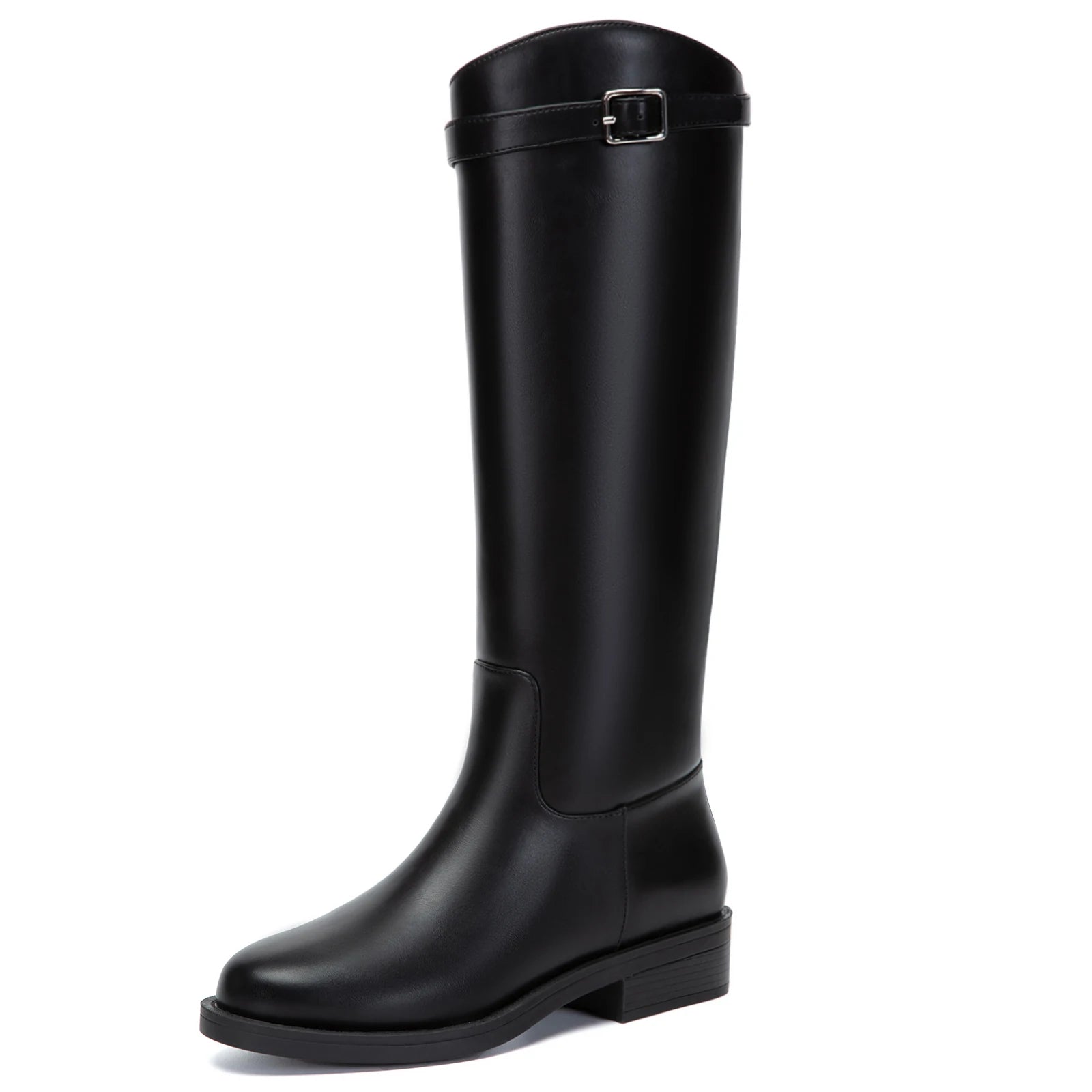 Athlefit Women's Knee High Riding Boots Round Toe Low Heel Tall Boots Pull On Long Booties with Buckle
