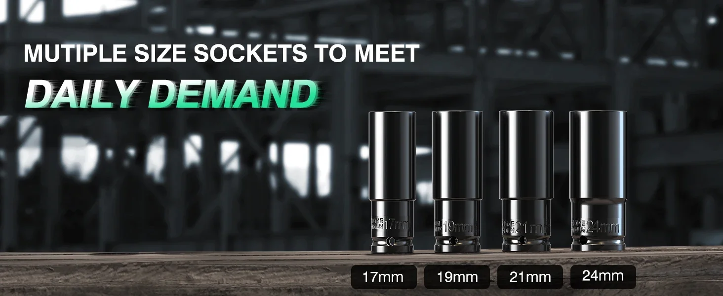 4 Impact Sockets: 17mm, 19mm, 21mm, 24mm (F-150/Chevy Silverado tire sizes)