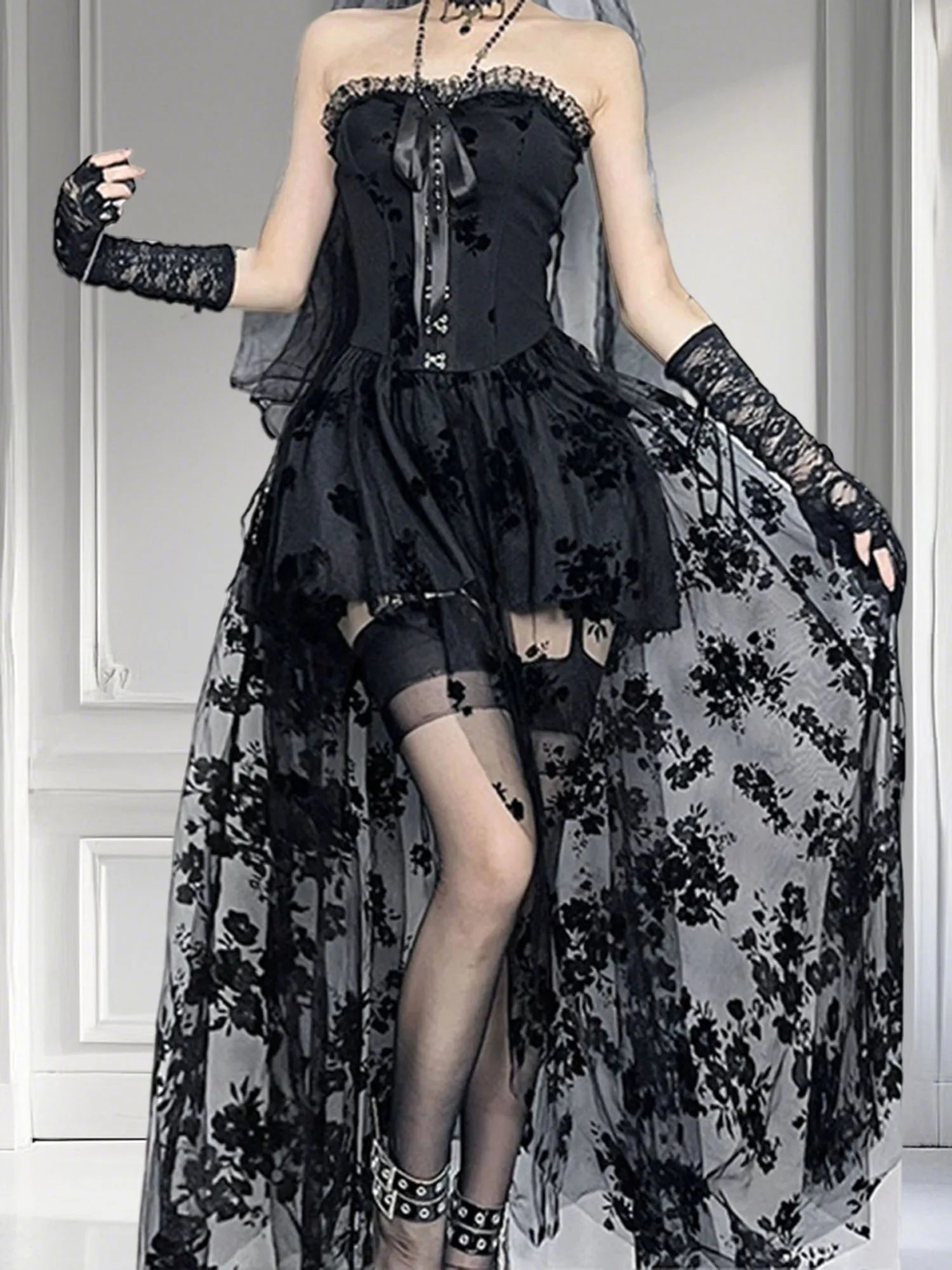 Mesh Tube Top Long Dress for Women Gothic Floral Embroidery Strapless Sleeveless A Line DressSize (cm)