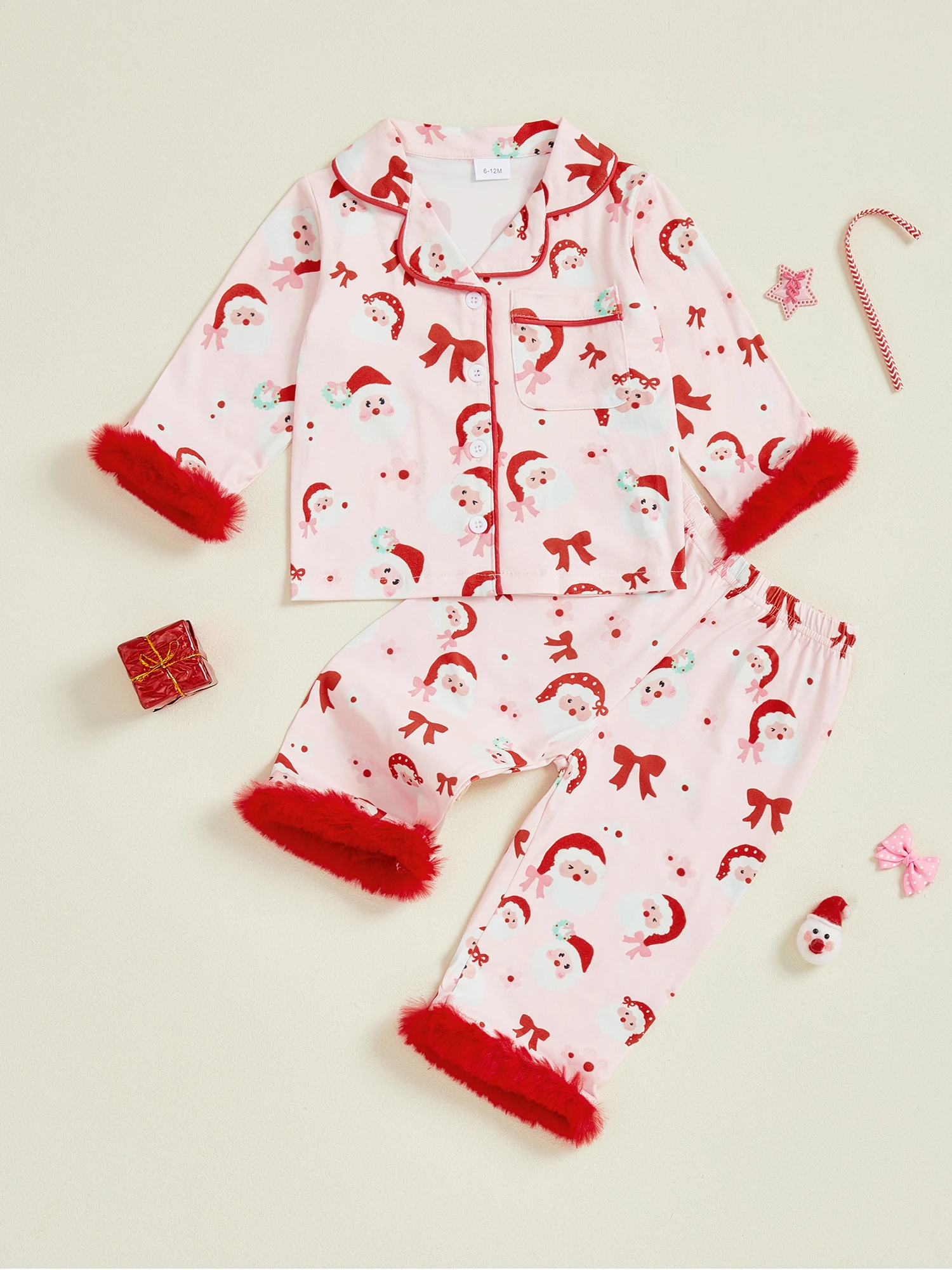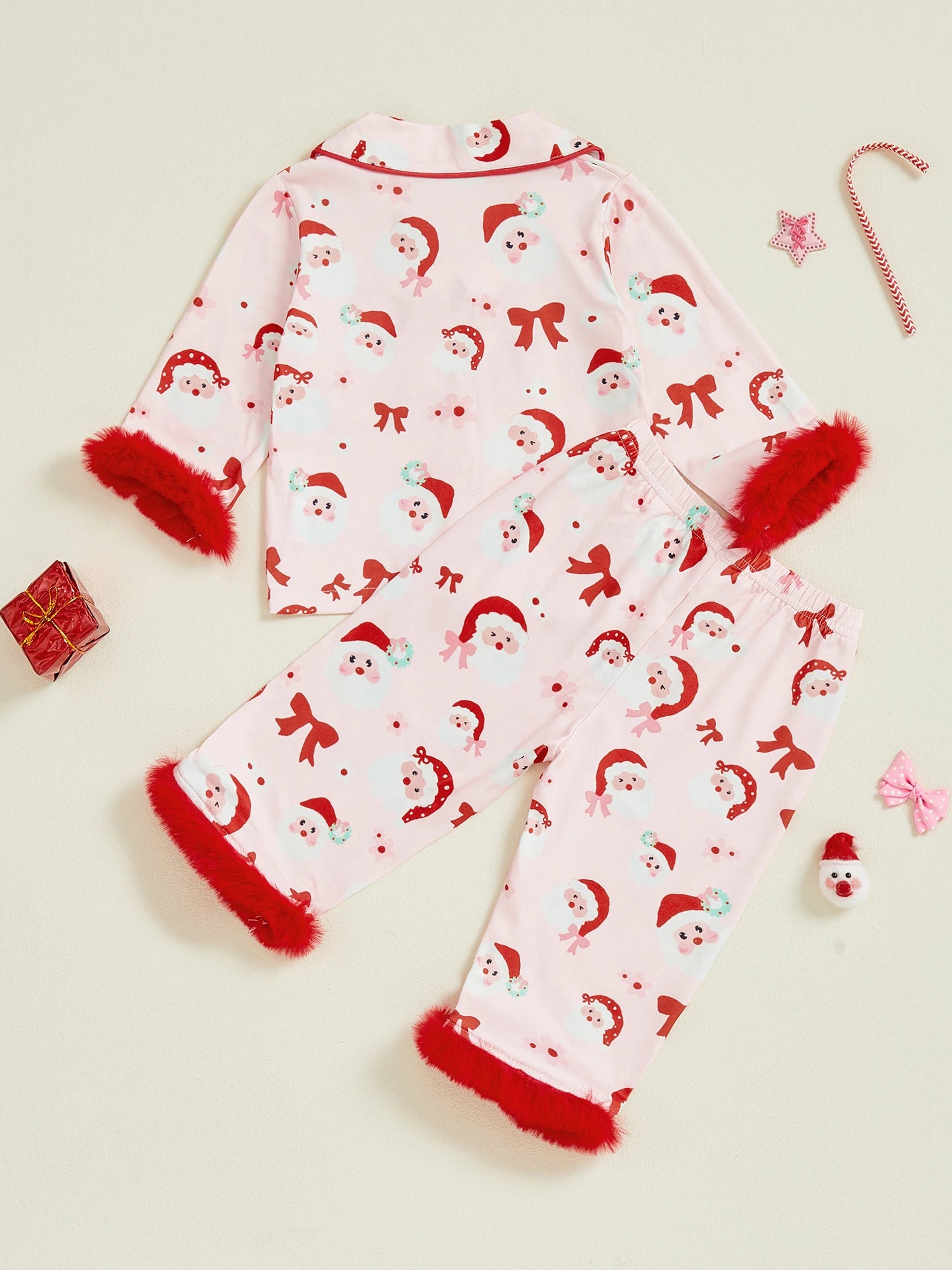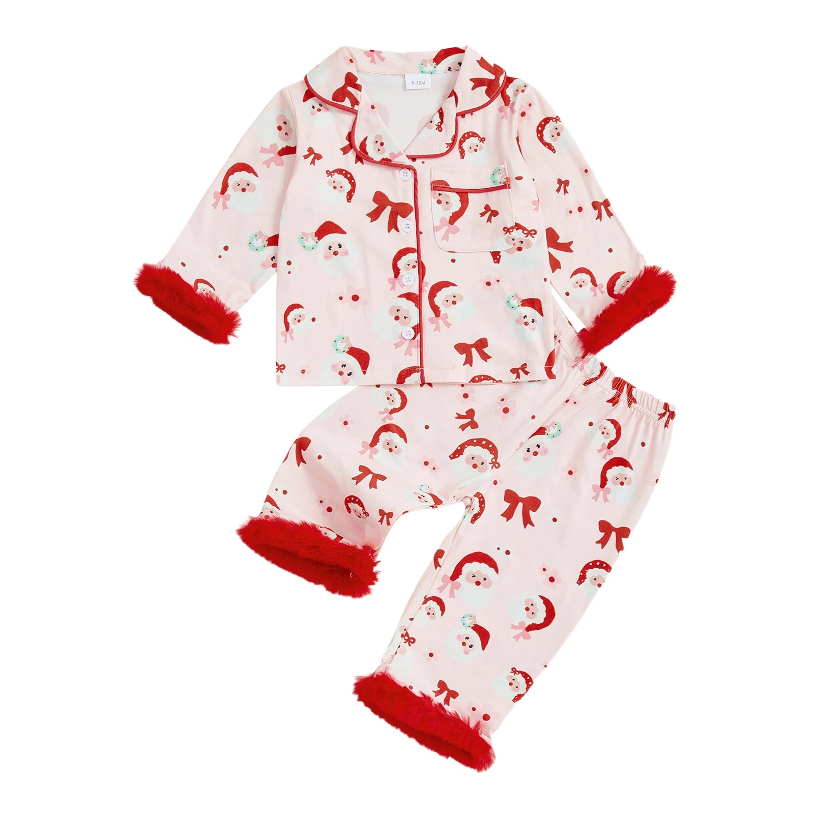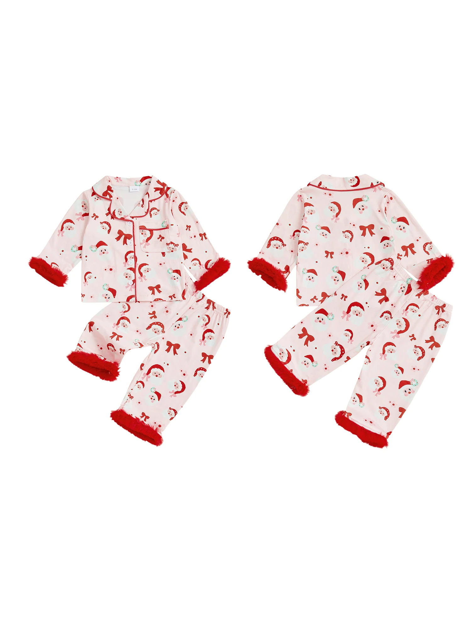 Little Girl Christmas Pajama Set Santa Bow Print Fuzzy Trim Long Sleeve Tops and Elastic Waist Pants 2 Piece Sleepwear OutfitSize (cm)