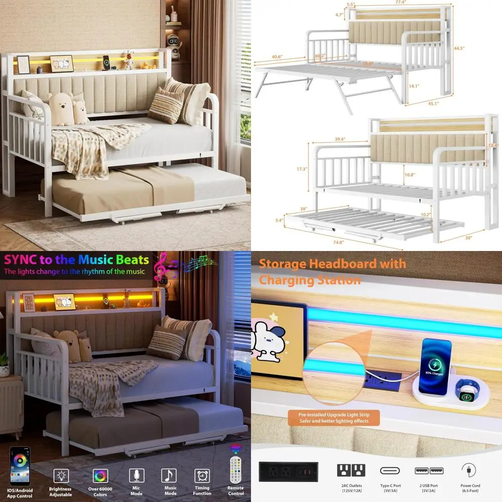 This versatile daybed with trundle design offers maximum flexibility for your space. It features a pop-up trundle with locking wheels, allowing you to easily convert it into two twin beds or combine them into a spacious king-size bed. Perfect for small spaces, bedrooms, living rooms, guest rooms, or kids' rooms, this twin daybed with trundle adapts to your needs. During the day, it provides a comfortable seating area and extra sleeping space at night. The day bed frame twin combines industrial vintage aesthetics with functionality. The rust-resistant white metal frame and high-quality MDF in wooden color create an attractive look. The 13.5'' high upholstered headboard, made of breathable, stain-resistant linen fabric filled with high-density foam, offers comfort and an industrial ambiance for any room. The headboard is equipped with a built-in smart RGB LED light strip, providing over 16 million colors and 20+ preset lighting effects. Control it via buttons, app, or remote for various lighting needs, from reading to parties or as a nightlight for children. The LED lights also sync with music, offering an immersive home concert experience. This daybed features a storage headboard with a 5.5-inch deep open shelf and a built-in charging station, complete with 2 standard outlets, 2 USB ports, and 1 Type-C port. This ensures your devices are always charged and essentials are within reach. The trundle bed twin frame is crafted from heavy duty metal for exceptional durability and support, holding up to 880 lbs. Its embedded design prevents the mattress from sliding, ensuring stability while you sleep. The curved armrests add elegance and enhance comfort and safety. Assembly is straightforward, with clear instructions, labeled parts, and all necessary tools included. Precision-drilled holes make the process fast and effortless, allowing you to enjoy your new daybed without delay.