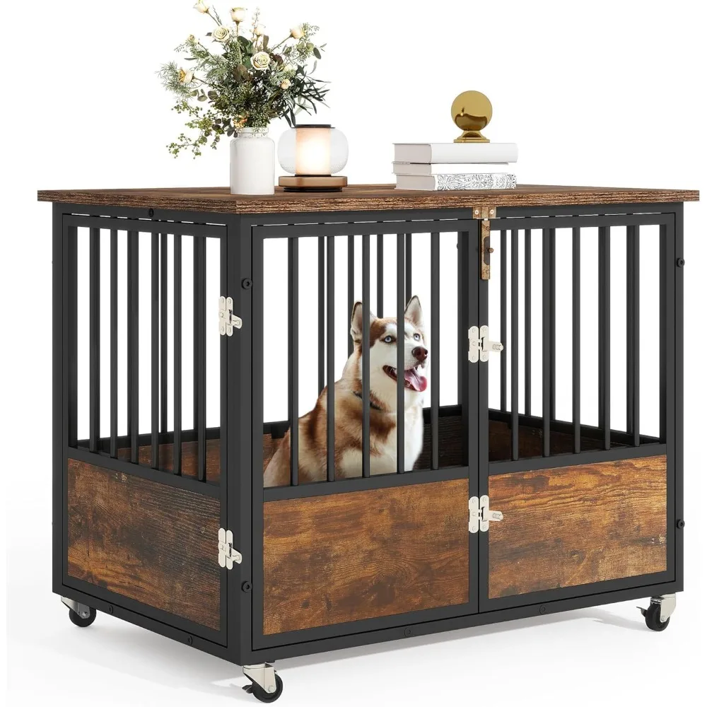 DWVO Dog Crate Furniture with Wheels, 38 Inch Dog Kennel Indoor Furniture End Table Dog Crate for Dogs, Farmhouse Decorative Woo