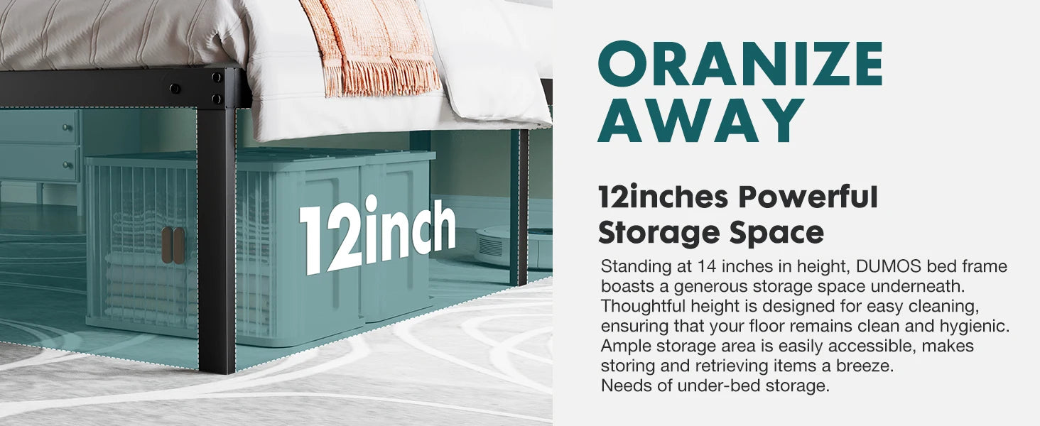 【Space Saving】Our bed frame has a large storage space under the bed, which brings you ample storage space and easy daily room cleaning, you can maximize arrange according to your needs for storing odds and ends. 14 inch height of the bed frame help reduce clutter in the room.