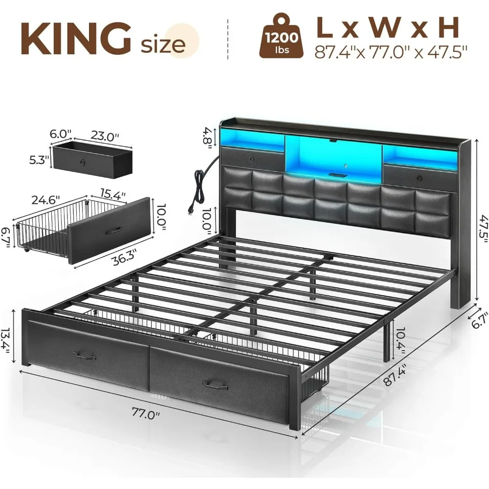 "king size upholstered bed frame with storage drawers, charging station, and led-illuminated headboard"