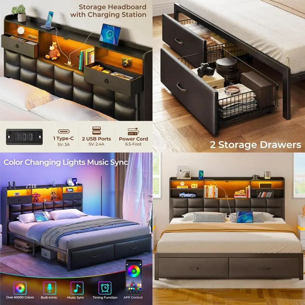 This bed frame, known as the Rolanstar, comes with a built-in charging station that includes two USB ports and one type-C port, making it easy to keep your devices charged and within reach. The headboard is upholstered, adding a touch of elegance to your bedroom and providing a comfortable backrest while keeping your essentials close at hand. The bed offers ample storage with three-layer shelves that can be used for both hidden and open storage to suit your needs. With a 10.4-inch clearance under the bed, it provides additional storage space, ensuring your room remains tidy and organized. Two fabric drawers with wheels are included, making it easy to store clothes or bedding and maximize the use of bed space without sacrificing organization. The bed frame features an integrated RGB LED light belt that can be customized for color, brightness, modes, and timing functions using a mobile app. Follow the simple setup instructions to create a vibrant and personalized atmosphere for various styles and occasions. The Rolanstar platform bed frame is constructed with an ultra-durable metal structure that supports weight evenly and won't warp or crack over time. It has a weight capacity of 1200 lbs, ensuring a secure and restful sleep, and the design eliminates the need for a box spring, adding to its convenience. This platform bed frame is designed to be noise-free, ensuring a peaceful sleep without any annoying squeaks. Assembly is easy with illustrated instructions, numbered parts, and all necessary tools included, making it a hassle-free setup experience. The frame is made from FSC-certified wood, ensuring sustainability and quality.