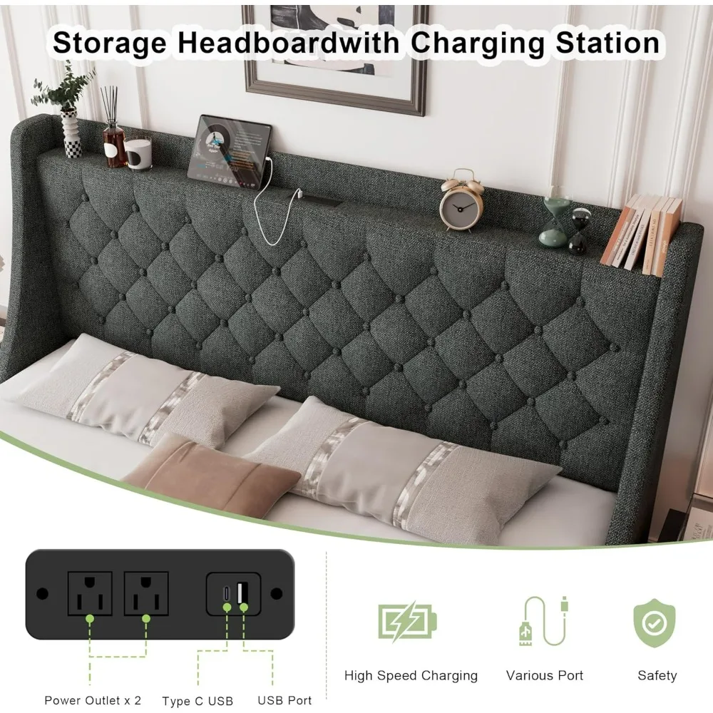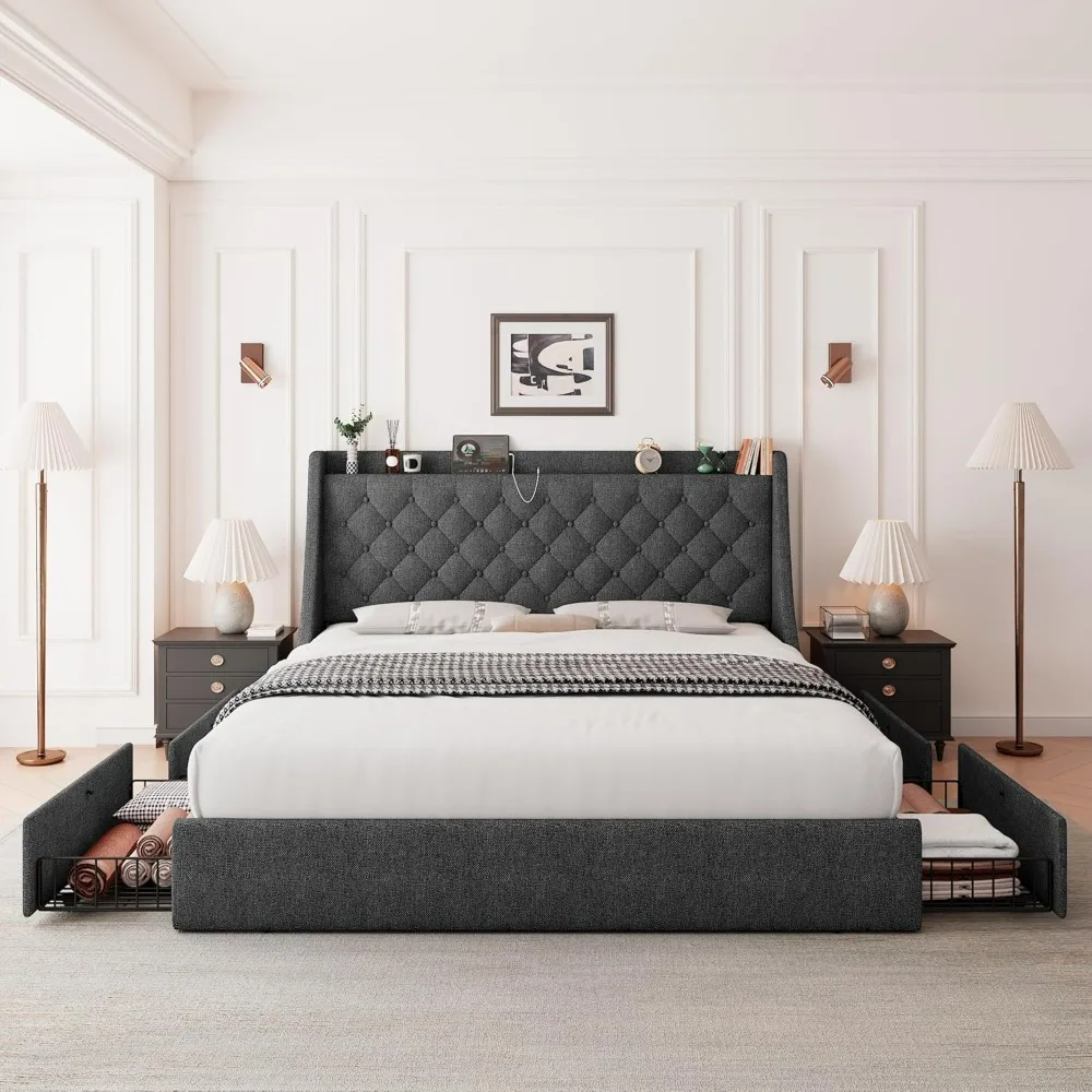 "king-size upholstered bed with 4 storage drawers, tufted wingback headboard and built-in charging station"