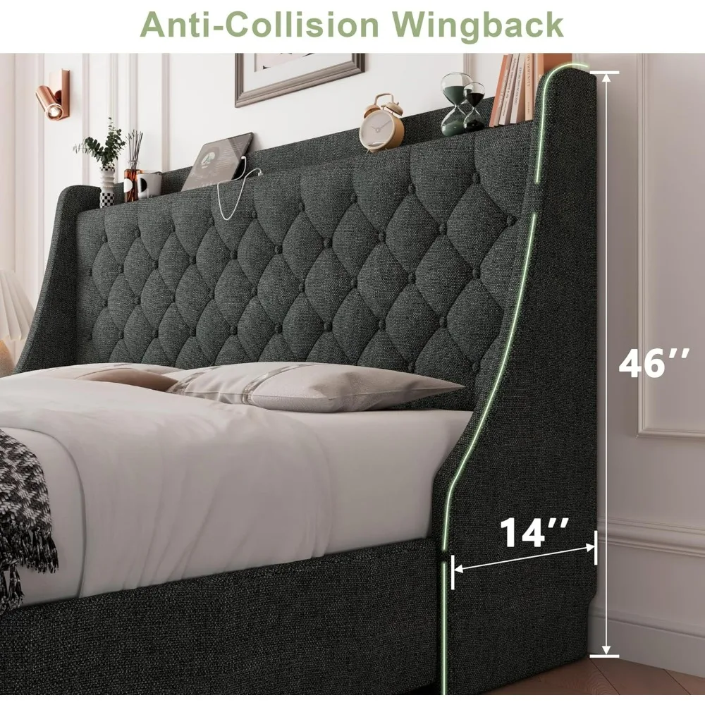 This product features several standout characteristics that make it a great addition to your bedroom: 1. Space-Saving Drawers: The bed comes with four discreet under-bed drawers that offer ample storage space for items such as bedding, seasonal clothing, and shoes. These drawers are equipped with built-in locks and smooth wheels for easy access, enhancing the functionality of your bedroom space. 2. Versatile Headboard: The headboard includes an integrated charging station for your electronic devices, supporting quick charging. Additionally, it has a spacious storage platform that keeps your essentials like clocks, photos, or books within arm's reach. 3. Enhanced Comfort with Wingback Design: The bed boasts a 16-inch wide wingback that provides greater support and comfort when leaning against the headboard. This design also improves the bed's stability and helps keep the mattress in place throughout the night. 4. Durable Construction: The bed frame is made from a robust metal frame and solid wooden slats, ensuring its strength and stability. It is capable of supporting weights up to 1000 pounds, making it a sturdy choice for your bedroom. 5. Simple Assembly and Silent Operation: The wooden slats have sheathes at each end, simplifying the assembly process without the need for screws. A noise-reducing strip between the bed and the metal frame minimizes friction, resulting in a quiet and peaceful sleeping environment without any squeaks or creaks.