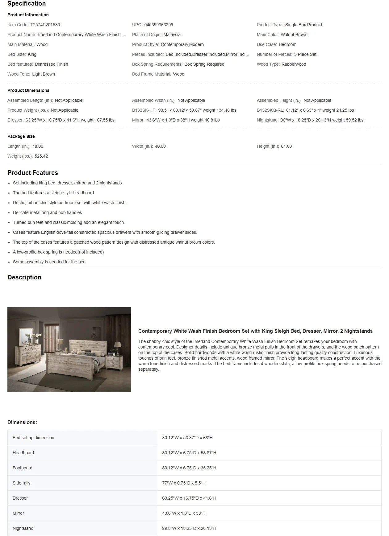 King Sleigh Bed Bedroom Set with White Wash Finish, Dresser, Mirror, 2 Nightstands