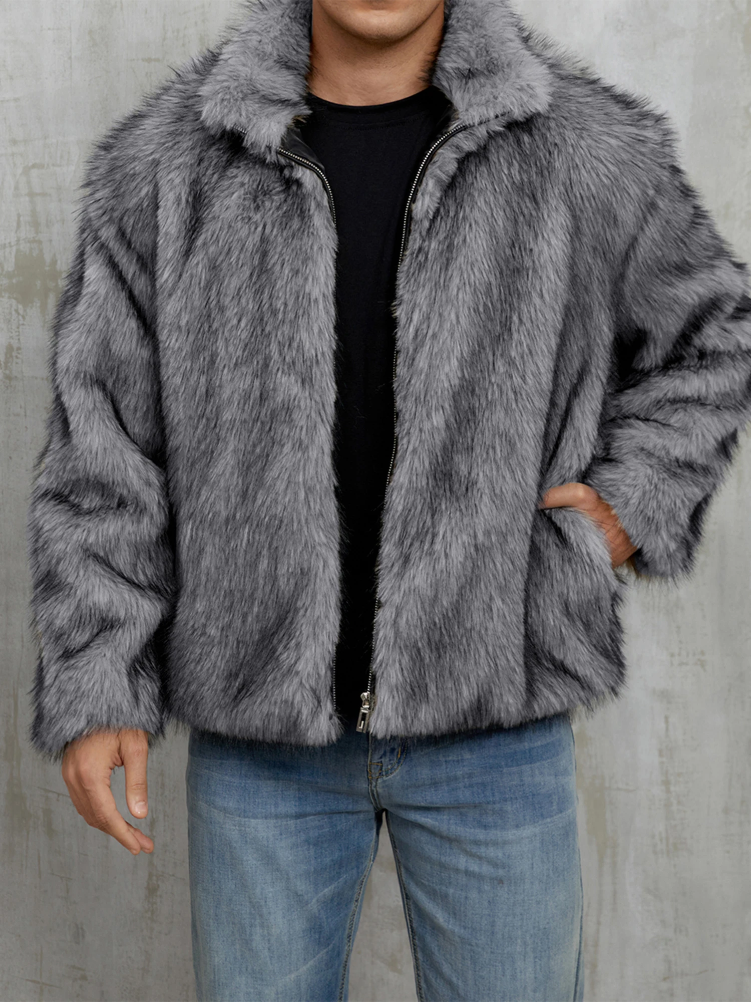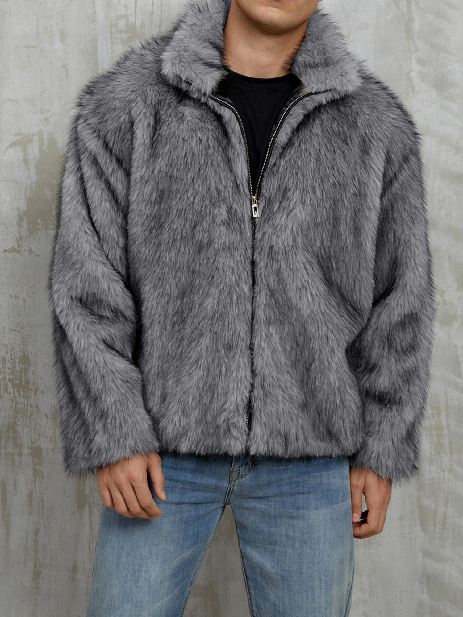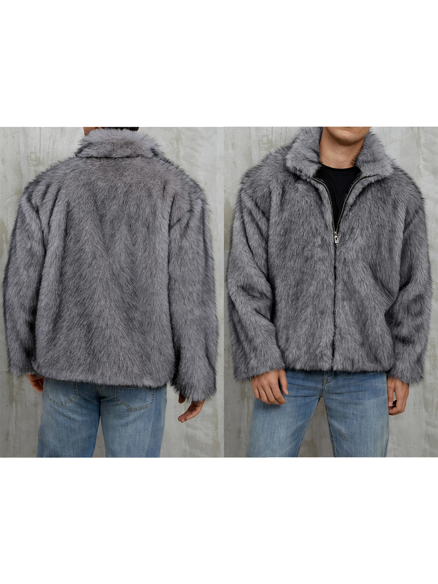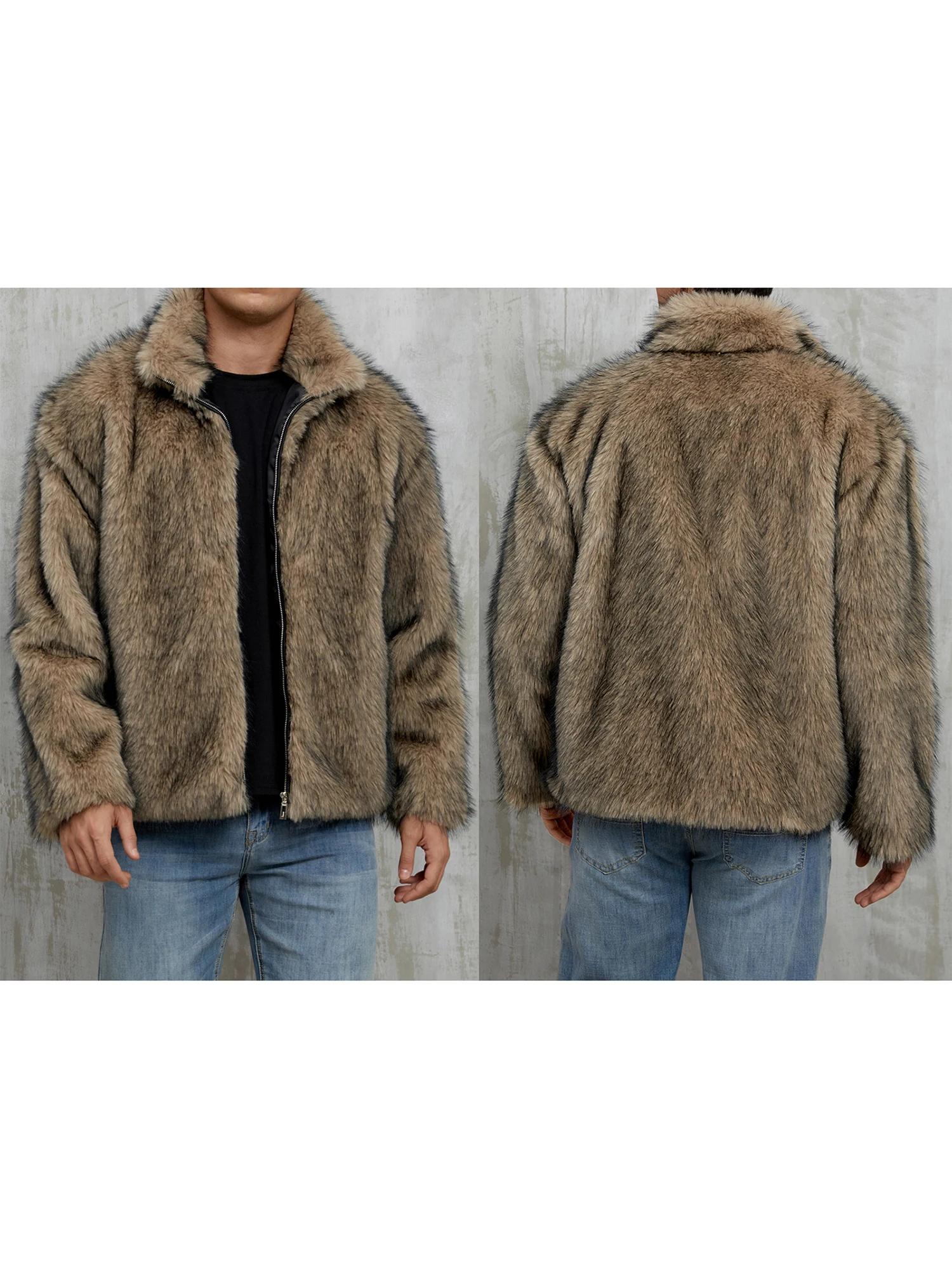 Mens Faux Fur Coat Winter Warm Long Sleeve Stand Collar Loose Zip Up Jacket OvercoatFeatures: