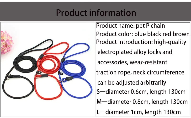 S: Rope Diameter is 0.6cm, Rope fits Small Breed Dogs; Length is 130cm (suit for dog weighting 3-9kgs)