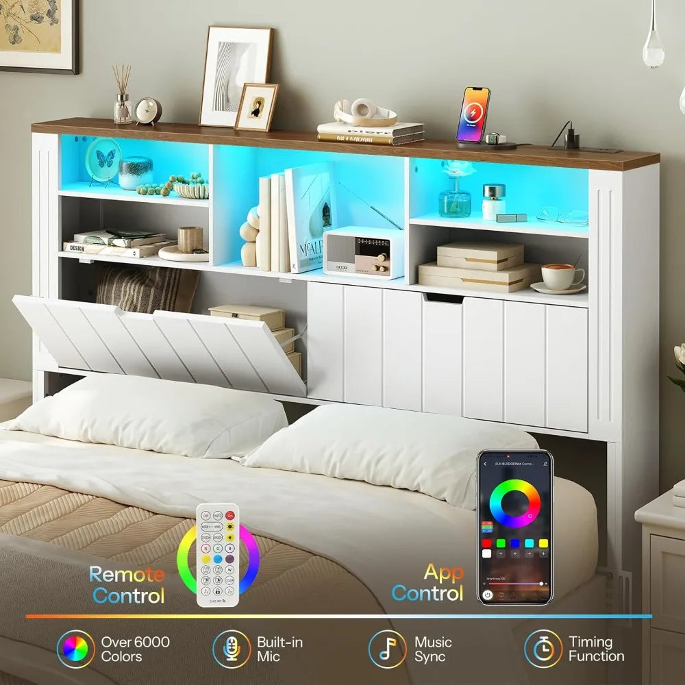 Queen Headboard Only, Bookcase Headboards with Charging Station and LED Lights, Farmhouse Headboard Queen Size with Storage