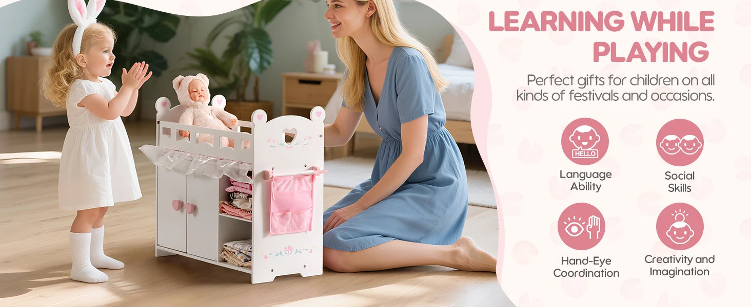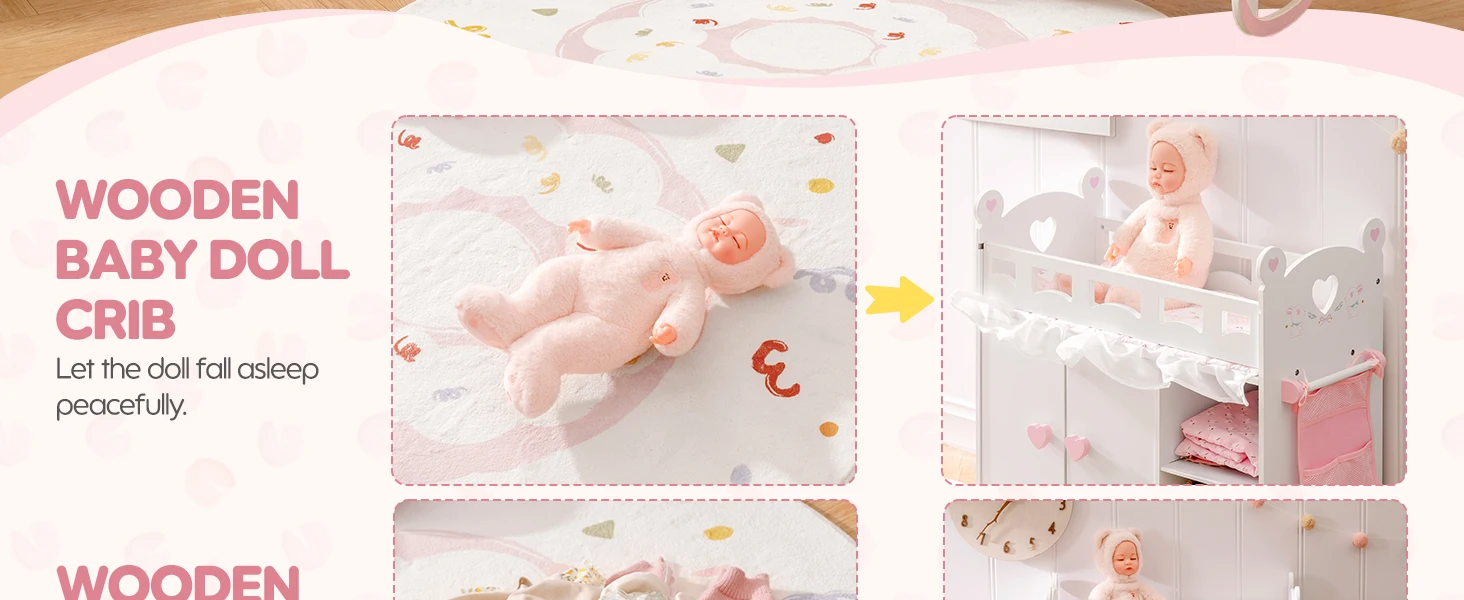 This baby doll bed combines a doll bed, wardrobe, and storage functions in one! With multiple compartments, it’s perfect for storing doll clothes, toys, and baby accessories. Includes an extra storage bag, 3 hangers, and a 3-piece bedding set, making organization easy and fun for children.