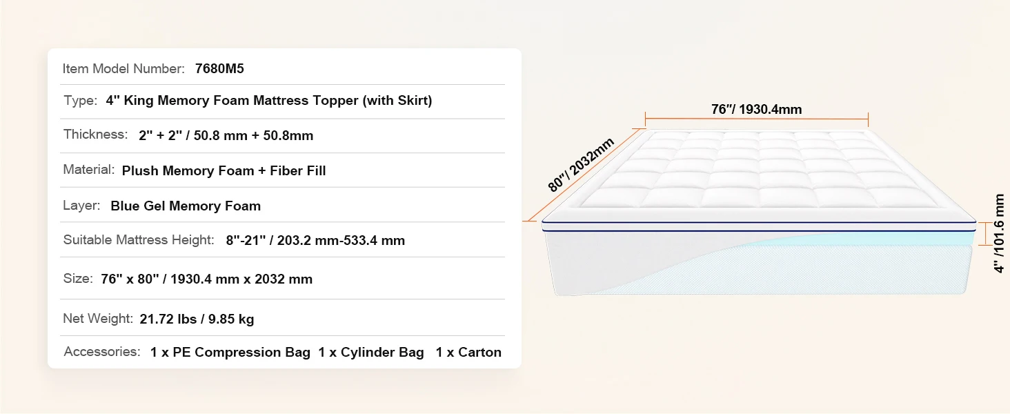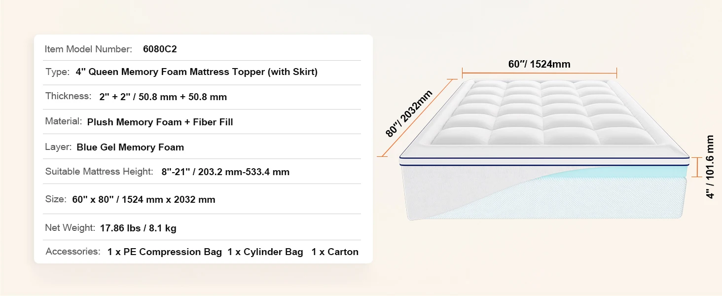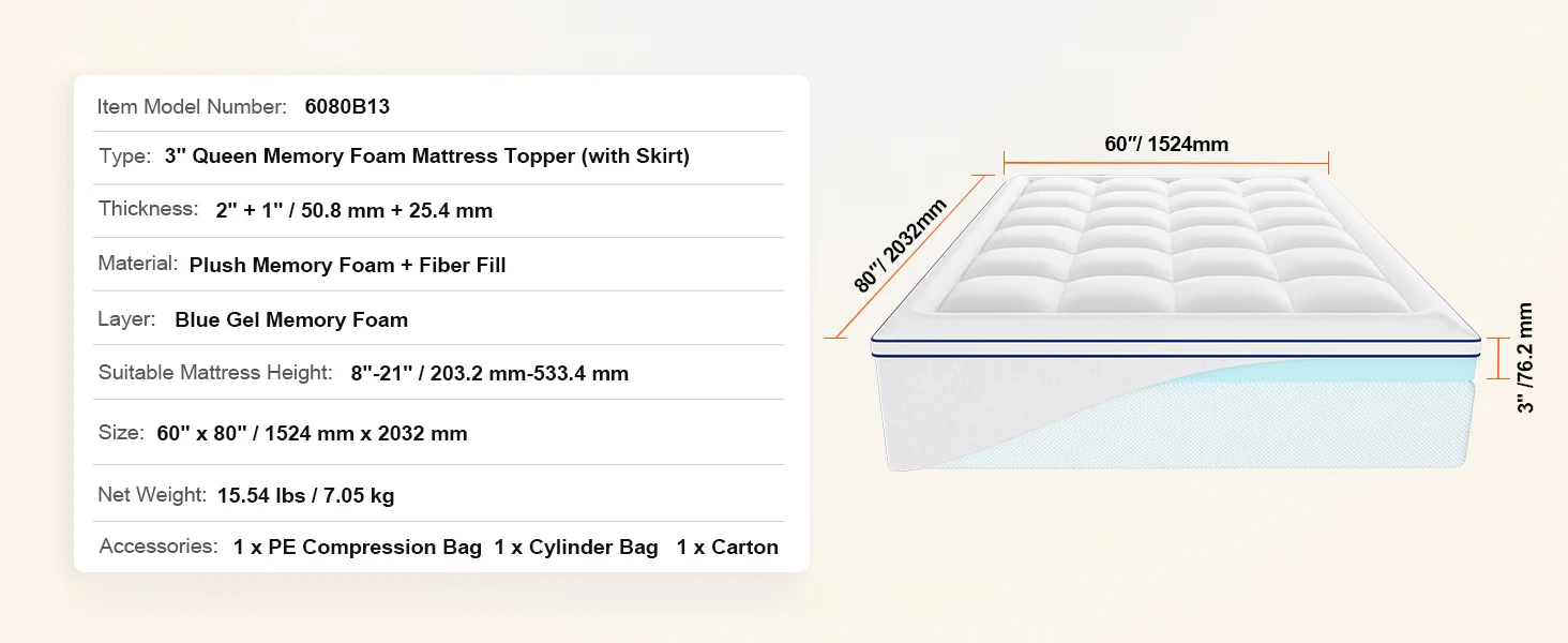 Item Model Number: 6080B13 Size: 1524 mm x 2032 mm / 60"" x 80"" Thickness: 50.8 mm + 25.4 mm / 2"" + 1"" Suitable Mattress Height: 203.2 mm-533.4 mm / 8""-21"" Material: Plush Memory Foam + Fiber Fill Layer: Blue Gel Memory Foam Net Weight: 7.05 kg / 15.54 lbs Type: 3"" Queen Memory Foam Mattress Topper (with Skirt)