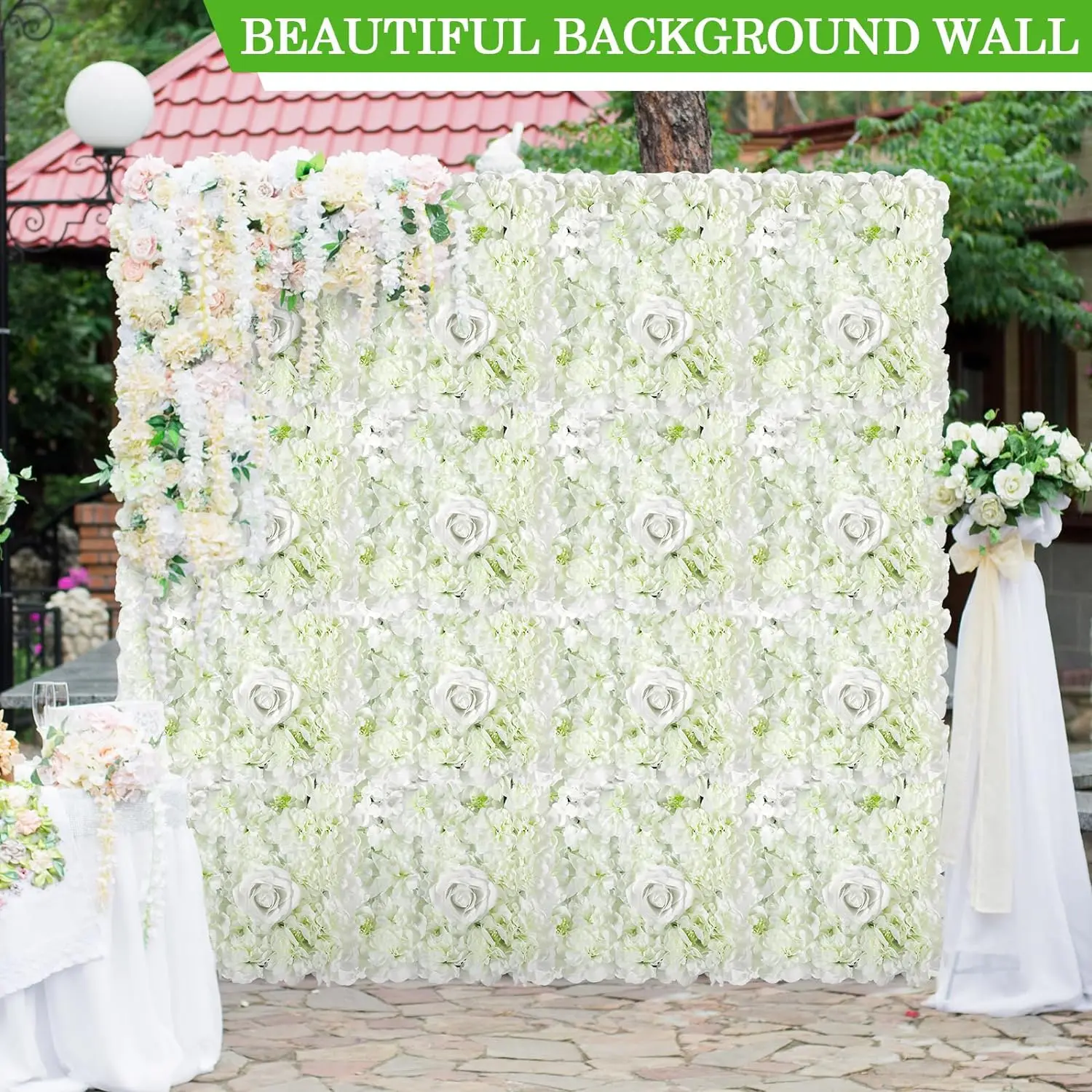 【Artificial Flower Wall Panels】: The package includes24 pcs flower wall backdrop, each flower panel is about 15 x 15 inches. Including assembled materials(100pcs zip ties,24 pcs wall hooks,1pcs hot melt rod).So you needn't buy them separately again.Pls noted: Backdrop Stand (Not Included).