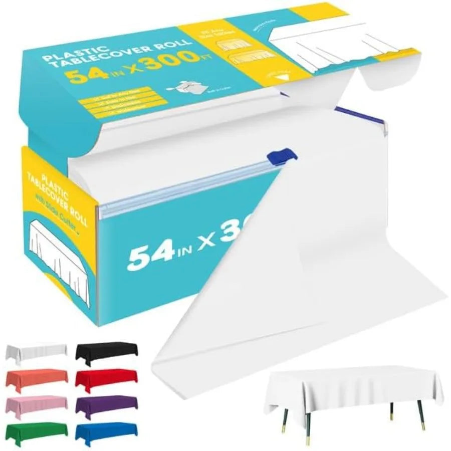 White Plastic Table Cover Roll 54IN x 300FT Disposable Table Cloth with Slide Cutter for Rectangle Tables CuttoSize Design Idea