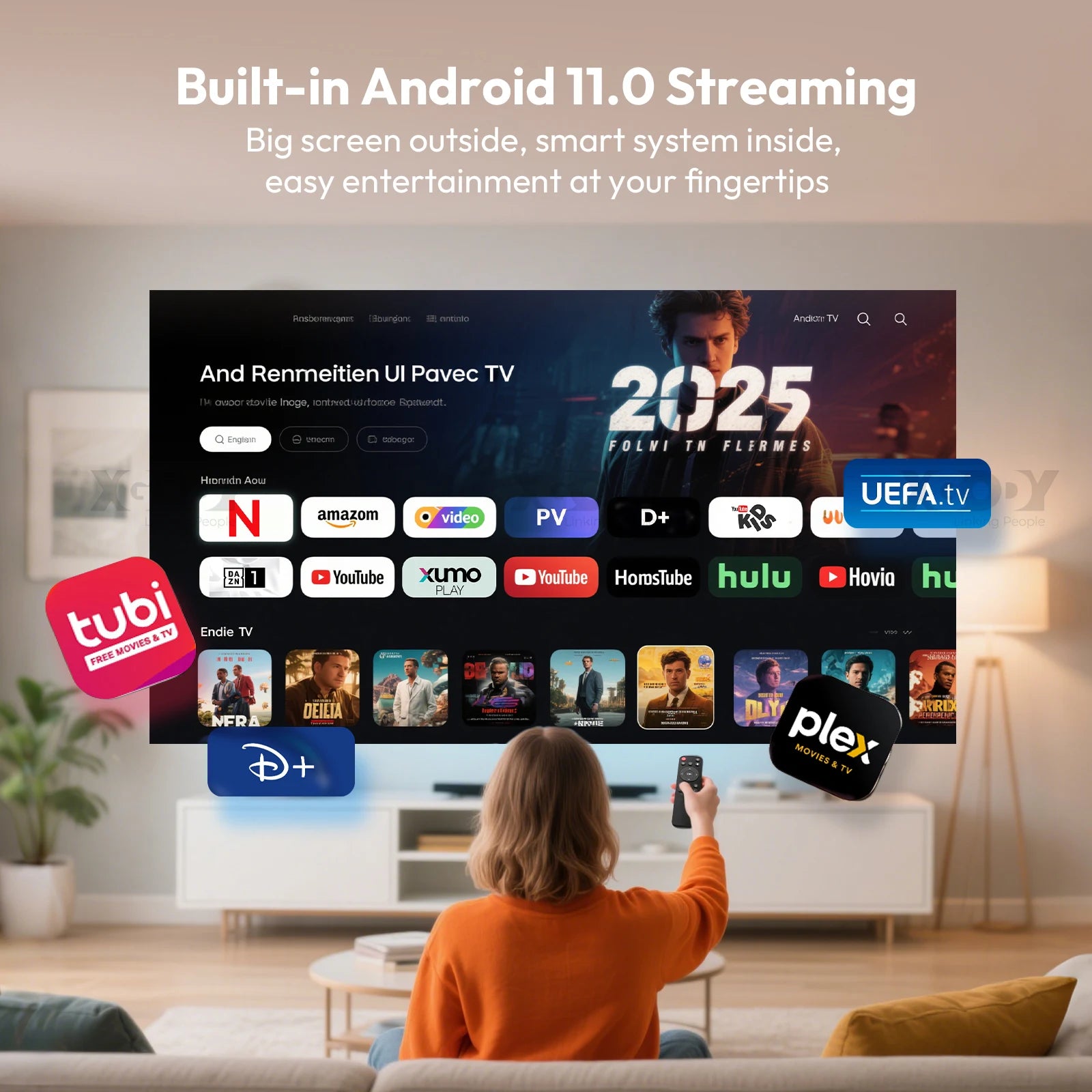 🔥Android 11 & Built-in dual band WiFi 6: This mini built-in dual 5G+2.4G projector latest wifi 6. 5G WiFi 6 offers a much smoother and lag-free online video experience. This means that the projection will be faster and more reliable. Just a single wi-fi connection. With Android 11, no matter where you go, you can watch movies or presentations on your favorite platform. No need to buy additional TV box. Very suitable for outdoor events.