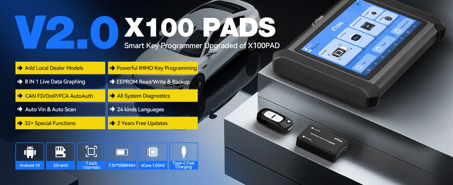 XTOOL X100 PADS V2.0 Key Programmer Automotive Scanner IMMO Read Write Chip All Key Lost OBD2 Diagnostic Tool With CANFD DOIP