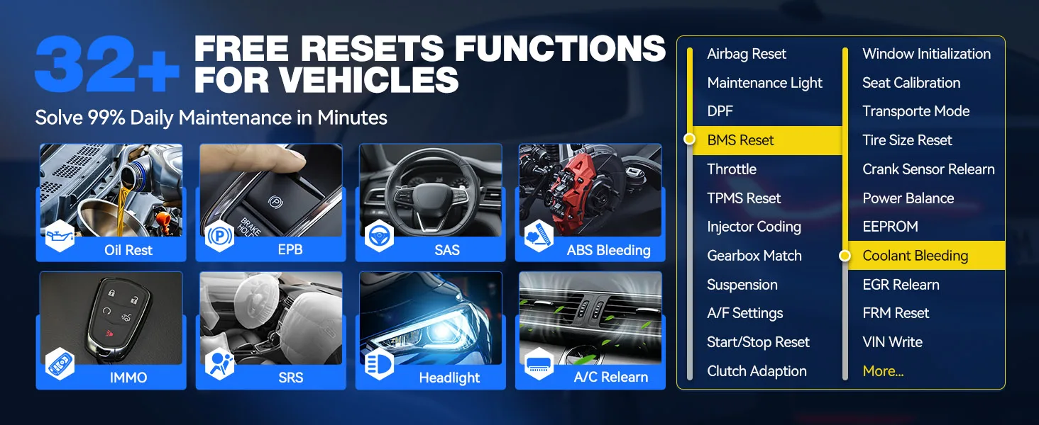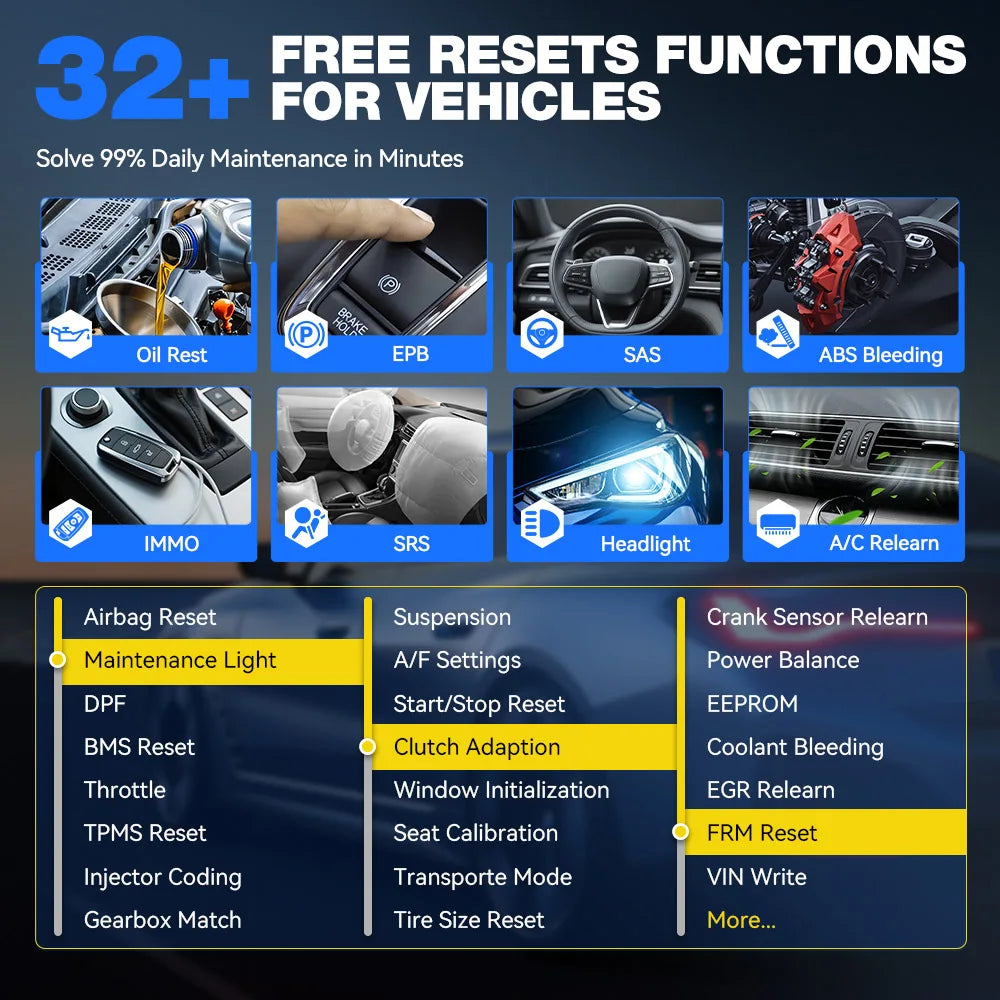 Also included:Throttle Relearn,Air Suspension Calibration,TPMS Reset,Seat Calibration, Cylinder, Transport Mode, Tire Upgrade, Electronic Pump Activation, DPF/GPF, SAS, Gear Learning, EPS, EGR Relearn, A/F Settings, FRM Reset, Start/Stop Reset, VIN Write, SRS, VGT Relearn, Clutch Adaption, A/C Relearn (NEW ADDED) and more