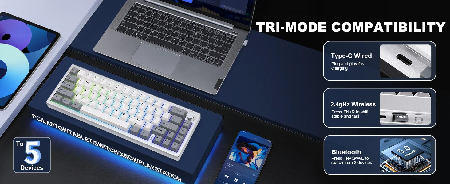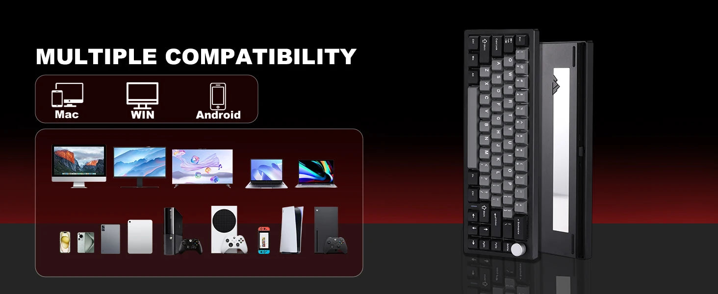 Stay connected across multiple devices with AL68. This wireless keyboard supports tri-mode connectivity—Bluetooth, 2.4G wireless, and USB wired, making it compatible with Mac, Windows, Linux, and more. Switch seamlessly between up to 5 devices, whether you’re using a tablet, laptop, PC, or smartphone. Build-in 6000mAh battery, enjoy up to 4 days of uninterrupted use when there is no RGB, making it the perfect companion for on-the-go productivity and gaming.
